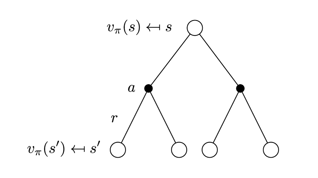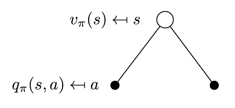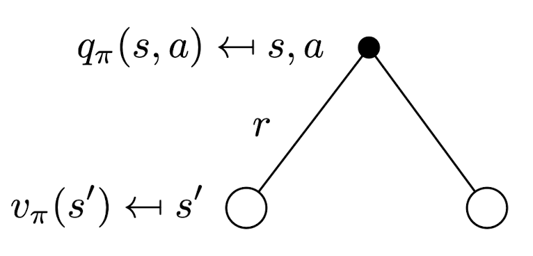 \[\begin{align*} v_\pi (s) &= \mathbb{E}[G_t | S_t = s] \\ &= \mathbb{E}[R_{t+1} + \gamma v_\pi(S_{t+1}) | S_t = s] \end{align*}\] \[\begin{align*} q_\pi(s, a) &= \mathbb{E}[G_t | S_t = s, A_t = a] \\ &= \mathbb{E}[R_{t+1} + \gamma q_\pi(S_{t+1}, A_{t+1}) | S_t = s, A_t = a] \end{align*}\]