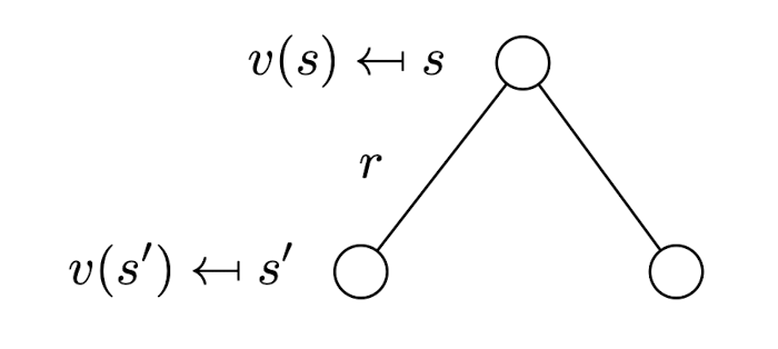 \[\begin{align*} v(s) &= \mathbb{E}[G_t | S_t = s] \\ &= \mathbb{E}[R_{t+1} + \gamma R_{t+2} + \gamma^{2} R_{t+3} + ... | S_t = s] \\ &= \mathbb{E}[R_{t+1} + \gamma(R_{t+2} + \gamma R_{t+3} + ...) | S_t = s] \\ &= \mathbb{E}[R_{t+1} + \gamma(G_{t+1}) | S_t = s] \\ &= \mathbb{E}[R_{t+1} + \gamma(v(S_{t+1})) | S_t = s] \\ \end{align*}\]