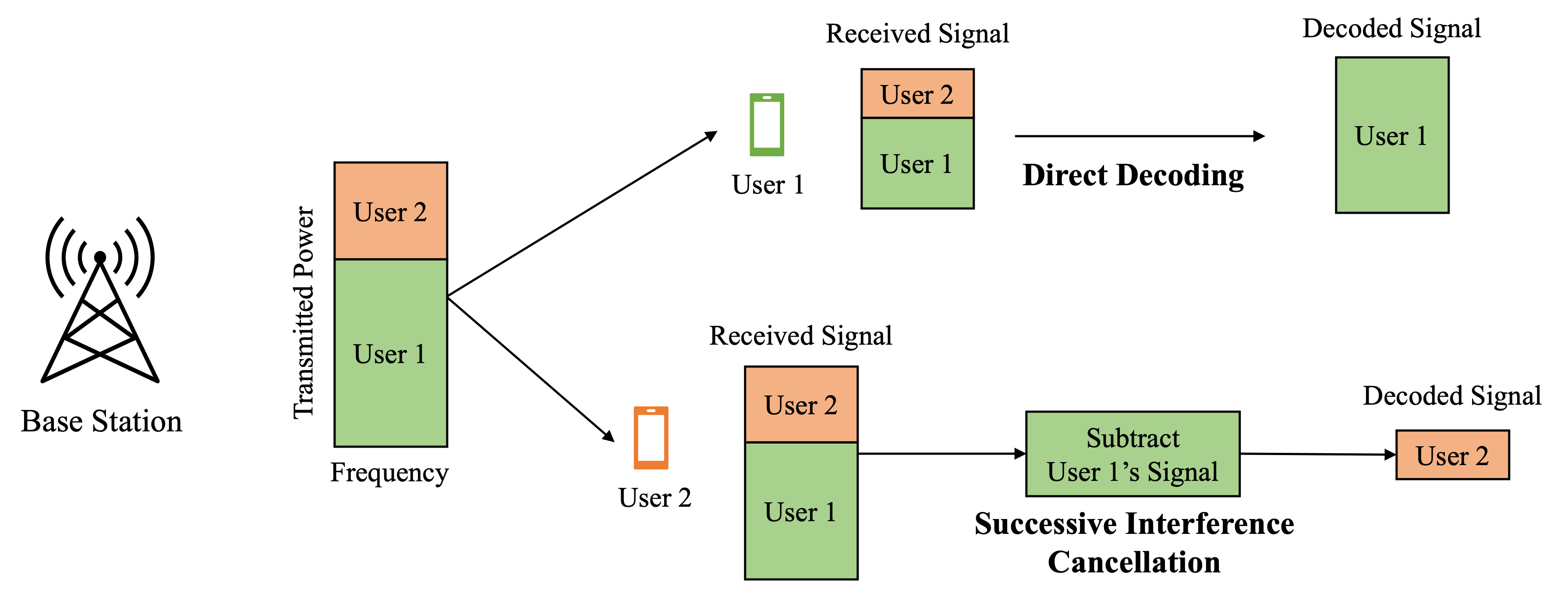 On the other hand, for stronger users, User 2, the receiver cannot tell the difference between the users within the same frequency band. o enable the stronger user’s receiver to distinguish between signals between User 1 and User 2, Successive Interference Cancellation (SIC) is employed, which works by leveraging the difference in received power levels. What SIC essentially does is subtracting the weaker user’s signal from the received data. After cancellation, the receiver can decode its own signal.